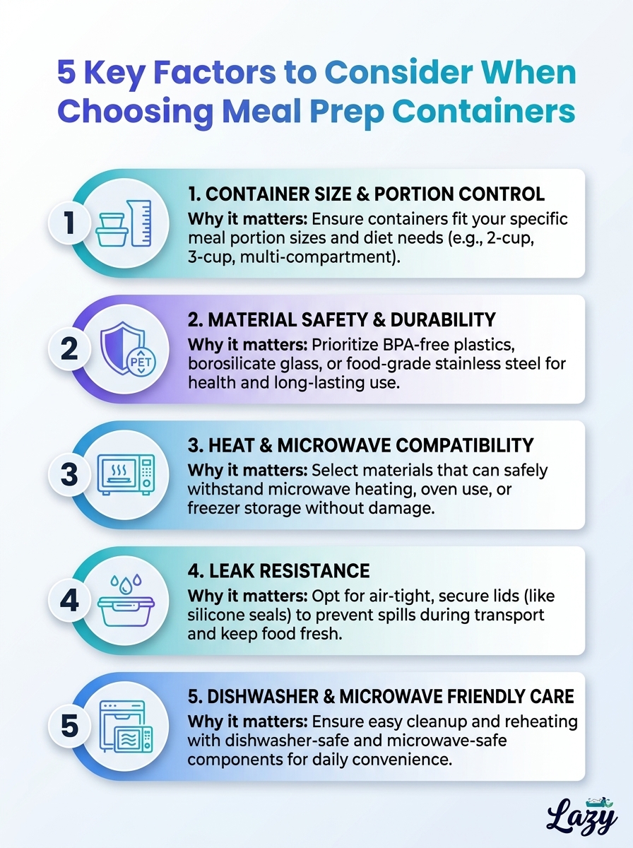 This infographic highlights the five factors to consider when choosing meal prep containers. Use these tips to pick durable, leak-proof, and freezer-safe options.