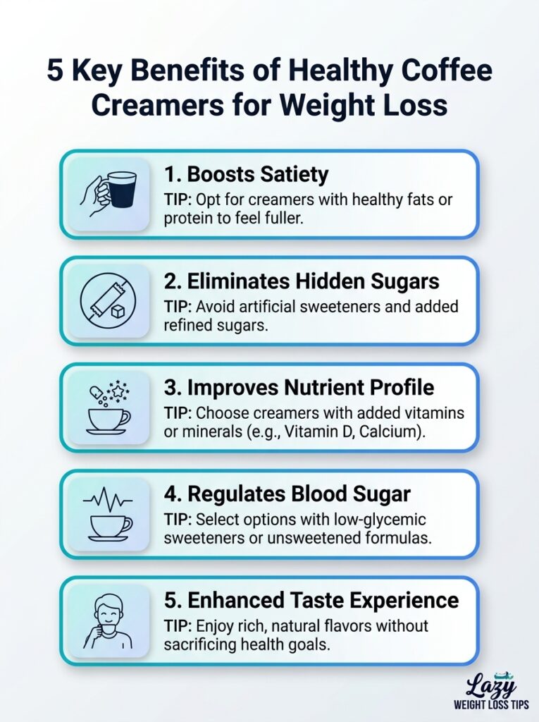 Explore five ways healthy coffee creamers can support weight loss, from satiety to better sugar control. Use these tips to choose smart creamer options.
