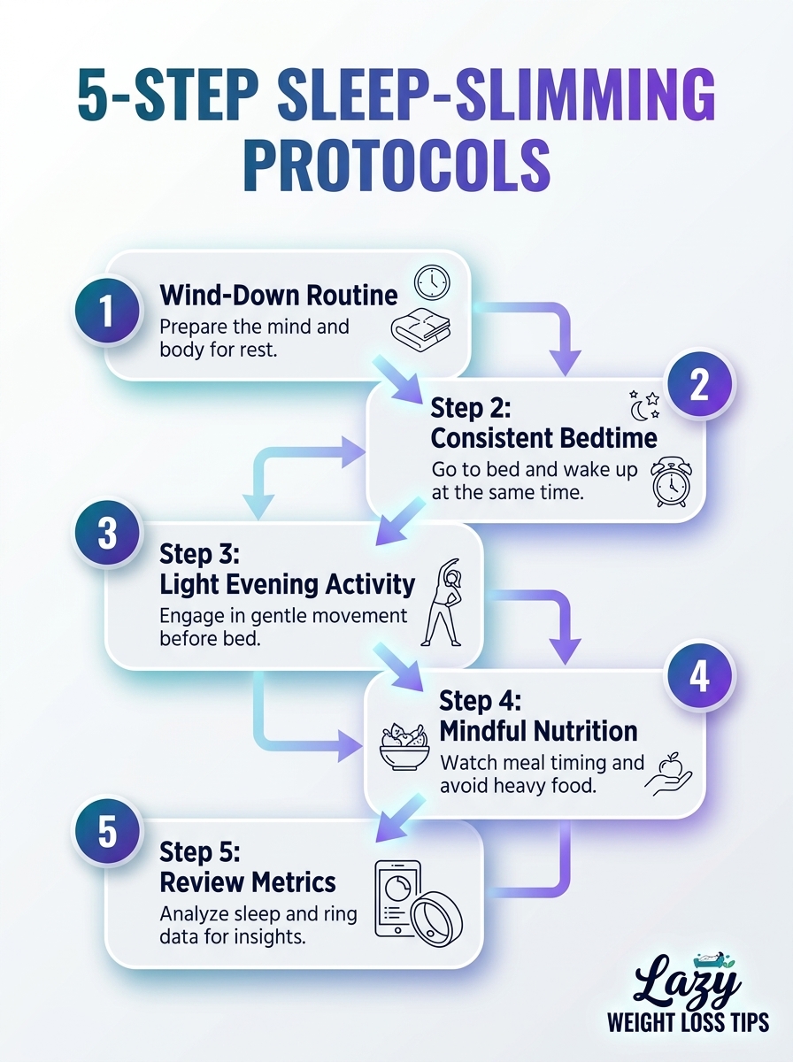 Infographic showing Smart Ring 'Sleep-Slimming' Protocols: a 5-step sleep-slimming visualization.