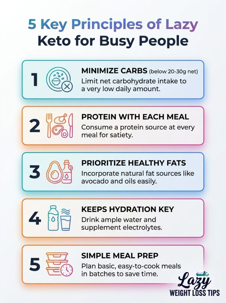 A quick, visual guide to the five core principles of lazy keto for busy people. Learn practical, time-saving keto strategies you can apply today.
